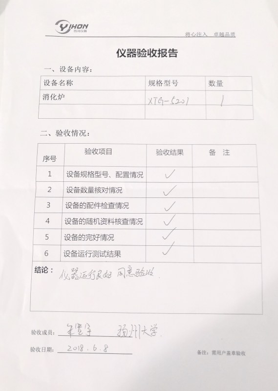揚(yáng)州大學(xué)近期采購消化爐XTG-5201一臺(tái),祎鴻已于6月完成產(chǎn)品驗(yàn)收。XTG-5201紅外消解儀采用電熱絲復(fù)合真空加熱技術(shù),升溫效率高,溫度均勻性好,可為揚(yáng)州大學(xué)相關(guān)專業(yè)對(duì)種子、土壤、植株、飼料、礦石等化學(xué)分析之前的樣品進(jìn)行消解處理。