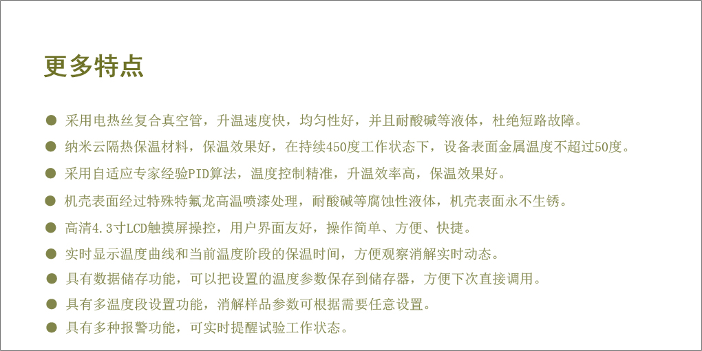 采用電熱絲復(fù)合真空加熱技術(shù),升溫效率高,溫度均勻性好。采用行業(yè)領(lǐng)先的納米云隔熱材料,熱效率高,節(jié)能環(huán)保。更具有4.3寸高清LCD觸摸屏操控界面,簡單易懂,并具實時顯示溫度曲線功能,摒棄了以往溫控表頭繁瑣的操作。 XTG5000真空電熱絲適用于食品、醫(yī)療、農(nóng)業(yè)、林業(yè)、生化等行業(yè)以及高等院校、科研部門對種子、土壤、植株、飼料、礦石等化學(xué)分析之前的樣品消解處理 |